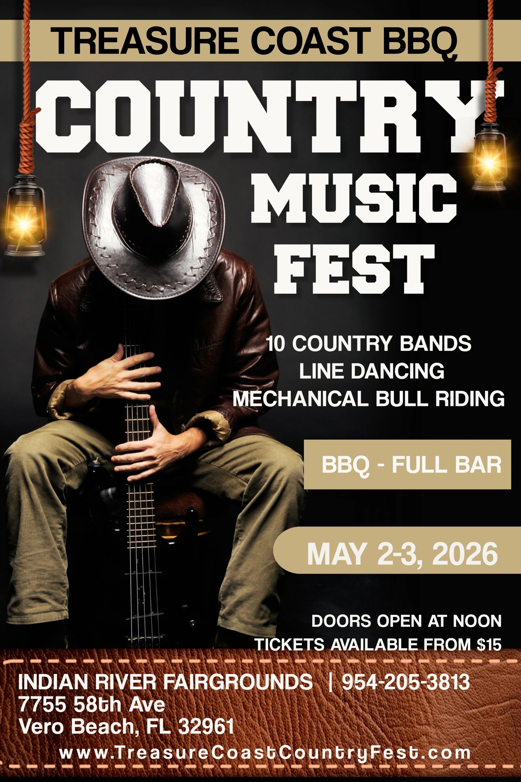The Treasure Coast Country BBQ & Music Festival will take place at the Indian River Fairgrounds, located at 7755 58th Ave, Vero Beach. The festivities run from Saturday, May 2 to Sunday, May 3, 2026. Tickets are now available for purchase.